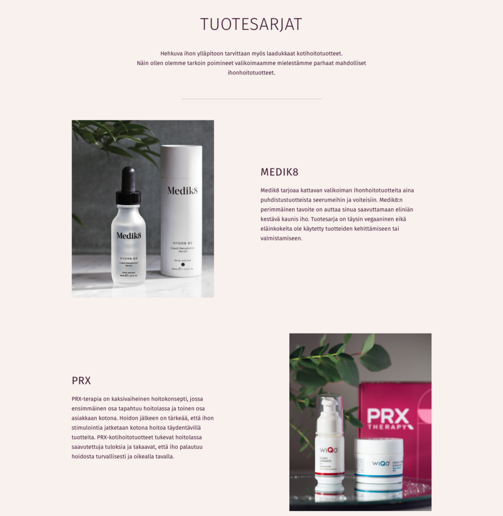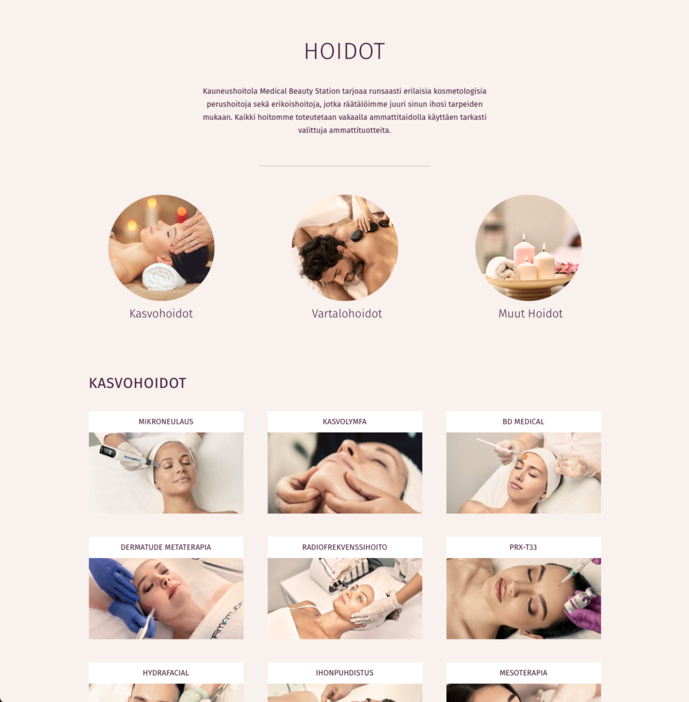 Medical Beauty Station is a beauty salon located in Kauniainen, the neighbouring city to Helsinki, Finland. During the winter 2022-2023 me together with a team from Storm Photography gave their websites a total overhaul and rebuilt their page from the ground up. The biggest focus was to make sure the backend was as simple as possible to use, since the owners of the salon are not overly keen in technology. We also put a lot of effort into making the site visually pleasing and produced a lot of the visual material ourselves.